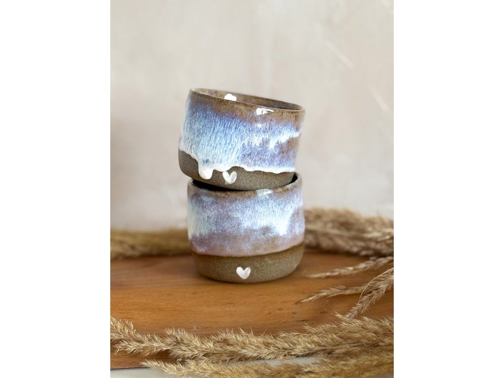 Ručně vyráběný keramický hrníček s jemnou glazurou v odstínech modré, bílé a lehce růžové. Při výpalu glazura přirozeně stéká a vytváří neopakovatelnou kresbu, díky které je každý kus originál. Spodní část v přírodním tónu hlíny doplňuje malé bílé srdíčko jako něžný detail.
