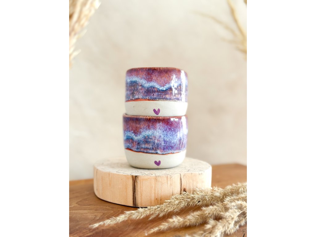 Jemná fialová glazura připomíná letní oblohu nad rozkvetlými lány levandule, a na spodním okraji najdete ručně malované fialové srdíčko – tichý podpis mé tvorby a symbol radosti z drobných okamžiků.