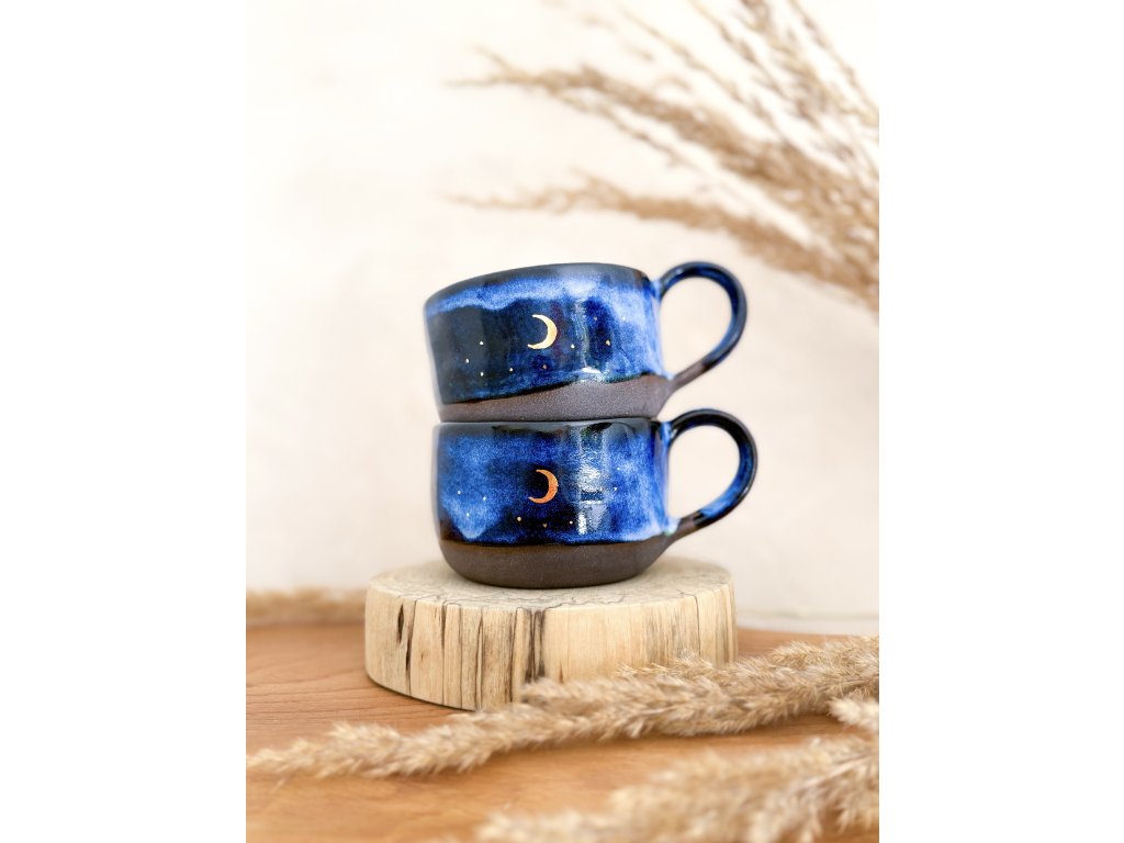 Hluboká černomodrá glazura připomíná noční oblohu a na jejím povrchu se třpytí zlatý měsíc, který přináší kouzlo i do všedních rán. Je to můj tichý podpis a pozvánka ke snění i během prvního šálku dne.